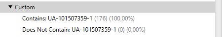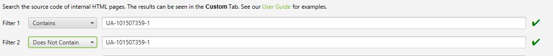 Als eerste zoek je de UA code van je website op, welke in GA vermeld staat en ook in de broncode van je homepage staat. Vervolgens open je SF en klik je linksboven op ‘Configuration’. Je selecteert ‘Custom’ en vervolgens ‘Search’. Je krijgt vervolgens onderstaand veld te zien, waarin je je UA code plakt. Het is belangrijk om één filter aan te maken waar de pagina’s mét UA code en een filter zónder.