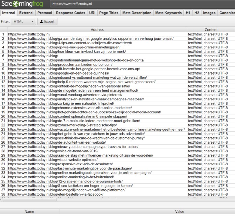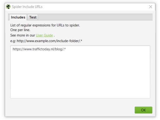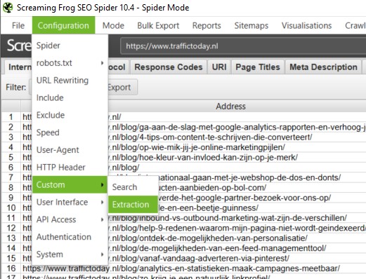 Regex is te gebruiken om Screaming Frog aan te geven welke URL’s opgenomen moeten worden in de crawllist en welke output Screaming Frog moet generen. Stel: we willen alle blogs van traffictoday.nl crawlen en als output weergeven.