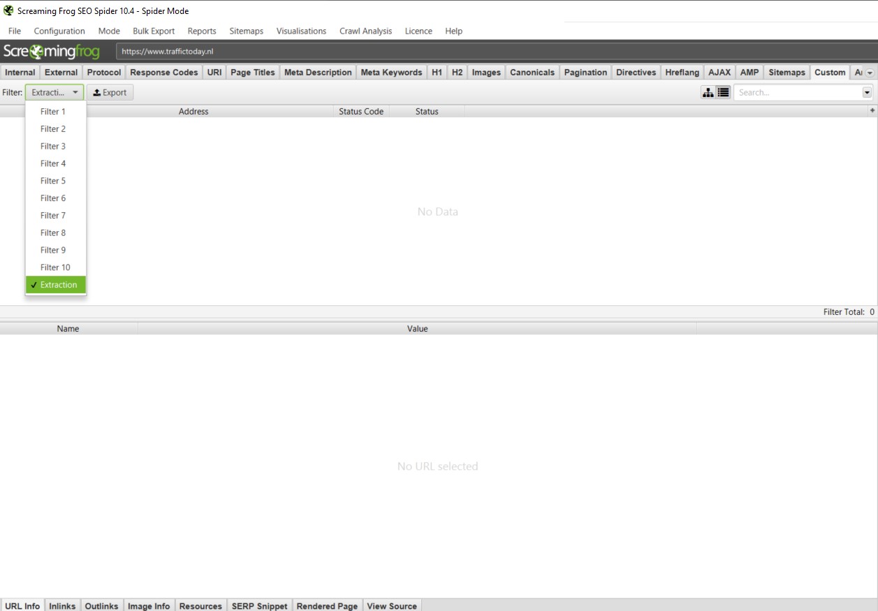 Nu kan je de crawl starten. Als hij klaar is, ga je naar de Custom tab. Deze vind je in het menu rechts, of in het header menu bovenin. Gelukkig, op de site van Traffic Today staat het allemaal goed!