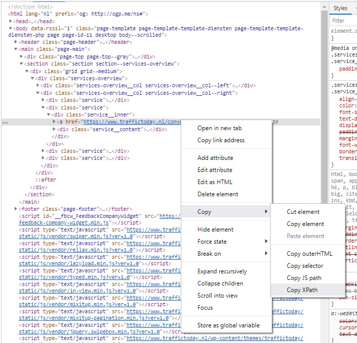 Google Chrome heeft een functie die het ontdekken van de XPath locatie eenvoudiger maakt. Met behulp van de Inspect-tool kun je met de rechtermuisknop op elk element klikken en de XPath-locatie kopiëren.