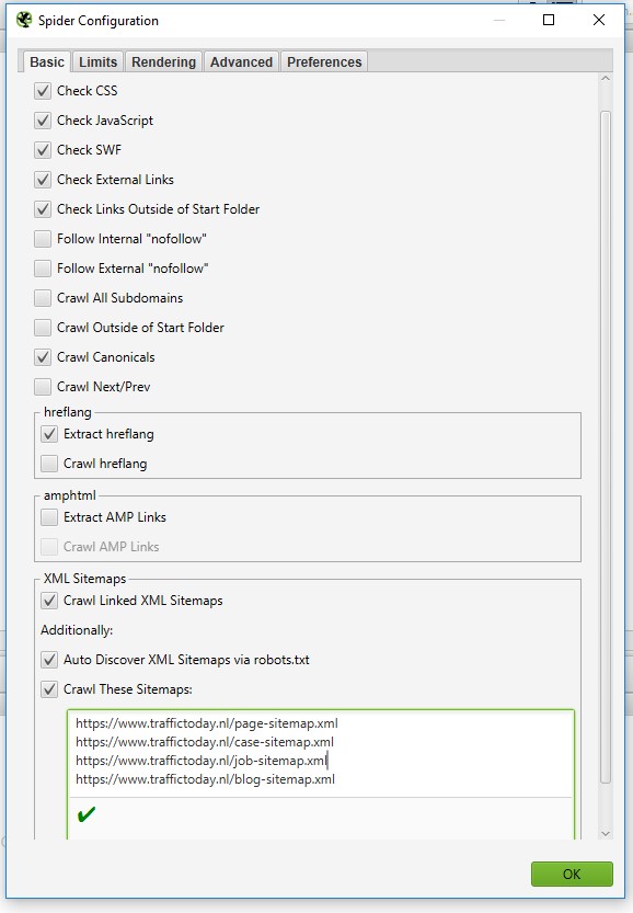 Onder ‘Configuration’ en dan de eerste optie ‘Spider’. Je komt op het onderstaande scherm. Vink ‘Crawl These Sitemaps’ aan, en schrijf je URL’s van al je sitemaps in het vak.
