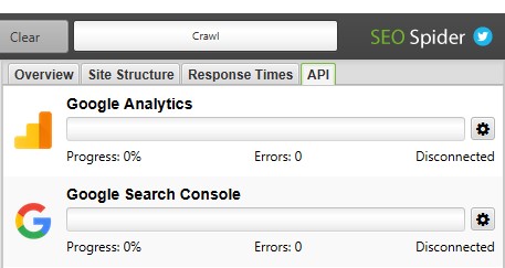 Na je sitemap, Google Analytics en Google Search Console te hebben ingesteld, kan je eindelijk de website crawlen. Rechts kan je in het tabblad ‘API’ zien of GA en GSC goed gecrawled worden.
