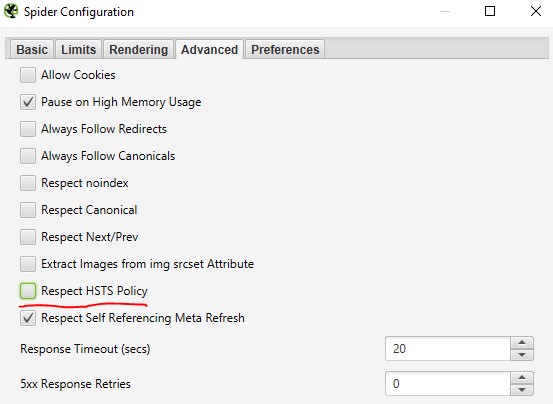 Screaming Frog heeft een functie om de HSTS policy te negeren. Als deze functie is ingeschakeld, wordt gekeken of het achterliggende 301 redirect van HTTP naar HTTPS wel goed werkt.