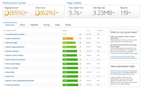 De scores die je ziet zijn gebaseerd op Page Speed Insights en YSlow. Deze scores zijn opgedeeld in elementen die je individueel kunt optimaliseren. Kom je er niet uit? Dan krijg je van GTMetrix een uitgebreide uitleg met hoe je dit op een juiste manier verbetert. In bovenstaande afbeelding zie je bovendien dat ieder verbeterpunt is opgedeeld in een categorie. Zo zie je Content, JS, CSS, Cookie, Images of Server (waar hosting een enorme invloed op heeft) staan. Op deze manier krijg je in één oogopslag te zien welk onderdeel aandacht behoeft. Als je een gratis account aanmaakt, dan heb je ook de mogelijkheid om je website te testen vanaf verschillende servers op de wereld, pas je de snelheid aan naar bijvoorbeeld 3G of test je met of zonder adblockers. Een ander voordeel van een gratis account bij GTMetrix is het feit dat je historische data krijgt. Zo zie je bijvoorbeeld precies wat de snelheid van je website een paar dagen geleden was en kan je vergelijken.