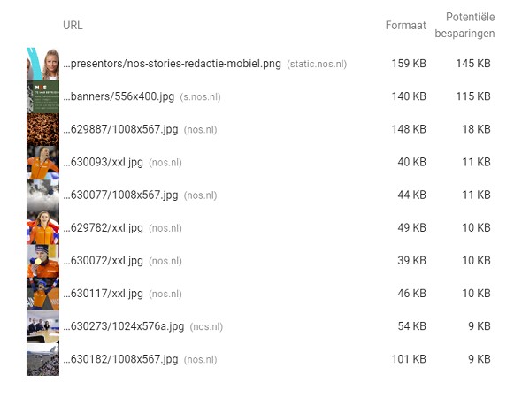 We benoemden deze al in de inleiding en deze tool van Google mag uiteraard niet ontbreken. Google Page Speed Insights is de meest gebruikte tool om de snelheid van websites te testen en dat is natuurlijk ook niet zo gek. De tool is enorm uitgebreid en je krijgt direct tips van Google om je snelheid te verbeteren. Zo zie je hieronder dat als we de website van de NOS door deze tool halen, dat zij eenvoudige snelheidsverbeteringen kunnen doorvoeren, simpelweg door afbeeldingen te optimaliseren: