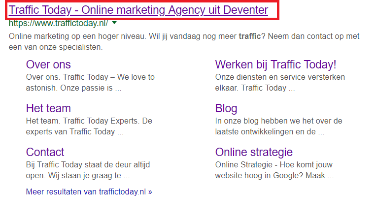 Sommige zullen de title tag ook wel kennen als de meta titel. De title tag is namelijk als het ware de titel van jouw pagina die in Google verschijnt.