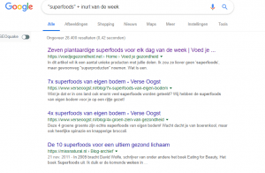 Met zoektermen als deze weet je zeker dat je veel lijstjes zal vinden. Een voorbeeld. Stel, jij hebt een shop in gezonde producten. We zoeken naar het zoekwoord Superfoods + Van de week. We gebruiken een Search Operator en, zie daar, talloze lijstjes vol met Superfoods van geweldige websites. Daar moet jij toch tussen staan?