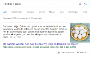 Stel. Je gaat een informatieve tekst schrijven over jouw product of dienst. Verplaats jezelf in je klanten en creëer een lijst met alle vragen die zij mogelijk kunnen hebben, en schrijf per vraag een kort en bondig antwoord dat geen ruimte laat voor variabele interpretatie. Leg alles uit zonder om de zaken heen te draaien. Behalve dat je content daarvan nuttiger wordt en beter gaat ranken, heb je zelfs kans op het gouden plekje in Google: de featured snippet. De featured snippet is een box bovenaan de pagina die extra informatie toont over de ingevoerde zoekterm. In de featured snippet staat doorgaan een klein afbeelding, zo’n 60 woorden aan tekst en een link naar een website. Zie onderstaand voorbeeld.