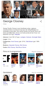 Misschien is het je al wel eens opgevallen. Eens in de zoveel tijd worden er nieuwe toepassingen toegevoegd aan de Google zoekresultaten. Zo hadden we enkele jaren geleden de featured snippets, waar we het in het vorige punt over hebben gehad. Recentelijk is Google slimmer geworden in het herkennen van informatie die aan elkaar gelinkt is. Wanneer men bijvoorbeeld een bekend persoon Googelt, krijg je direct allerlei gerelateerde informatie over die persoon. Wij nemen als voorbeeld George Clooney.