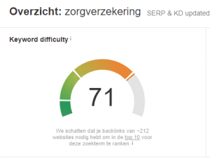 Hierboven hadden we het kort over het erg competitieve zoekwoord ‘Zorgverzekering’. Niet geheel verrassend scoort dit zoekwoord dus ook erg hoog in moeilijkheidsgraat. Om vanaf de 3e pagina naar de 1e te komen gaat je al, naar schatting, 212 backlinks kosten. Laat staan de eerste plek!