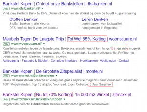 In deze advertenties is te zien dat er voornamelijk gebruik wordt gemaakt van korting en garantie. Voeg deze termen toe aan de title tag en de CTR zal waarschijnlijk omhoog gaan.