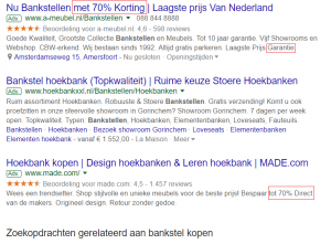 Alle advertenties die je zal zien in Google zijn geoptimaliseerd om zoveel mogelijk klikken te krijgen. Deze advertenties zijn dan ook het perfecte voorbeeld om te gebruiken bij het optimaliseren van de meta titel en meta beschrijving. Zoek bijvoorbeeld op het zoekwoord ‘bankstel kopen’. Je zult boven- en onderaan de pagina advertenties zien verschijnen.