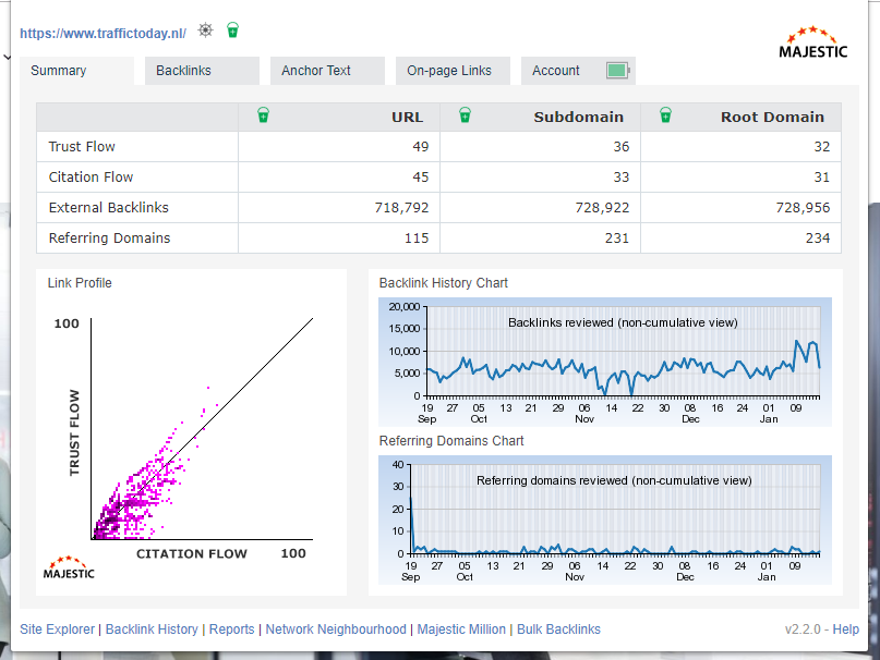 Majestic heeft net als andere bekende linkprofiel analysetools (Moz en Ahrefs) een Chrome-extensie gemaakt. Deze tool is wel iets anders. Het richt zich namelijk echt specifiek op een link profielanalyse in plaats van on-page-elementen. Je ziet snel en eenvoudig alle statistieken van Majestic, weergegeven in een lijst met de belangrijkste backlinks en ankerteksten. Er zijn ook shortcuts naar verschillende Majestic-tools. Indien je een Majestic account bezit zie je de meeste data, maar ook al heb je geen account, dan nog is deze Chrome extensie handig!