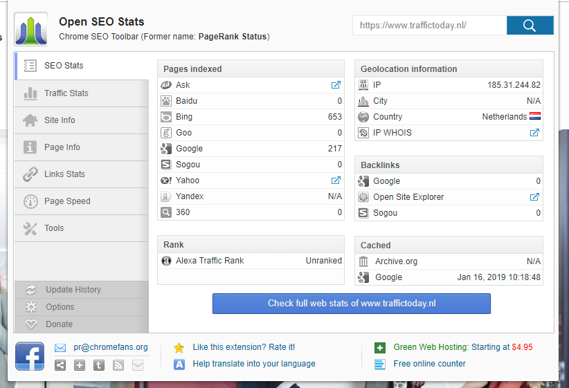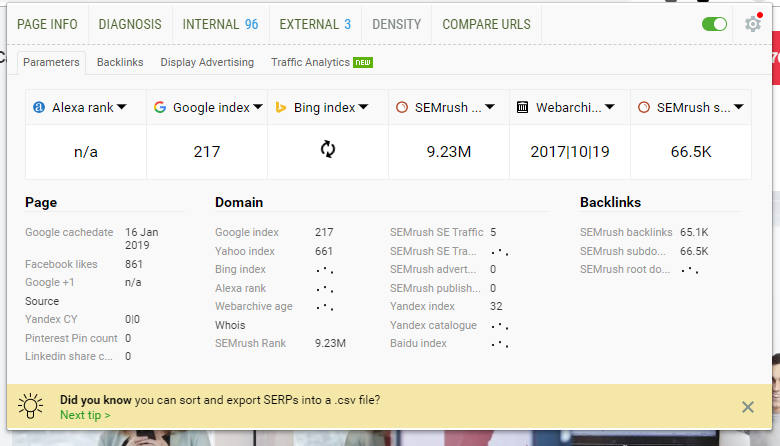 Deze Chrome-extensie is zeer uitgebreid en gedetailleerd. Het zal je helpen veel SEO-data te achterhalen van elke website die je bezoekt. Deze plug-in levert je veel data aan zoals sociale media-statistieken, maar ook diepgaande SEO-gegevens zoals het aantal backlinks, servergegevens, website laadtijd. Verder kan er data worden verzameld uit verschillende diensten, zoals Moz, Semrush, Archive.org en Majestic.