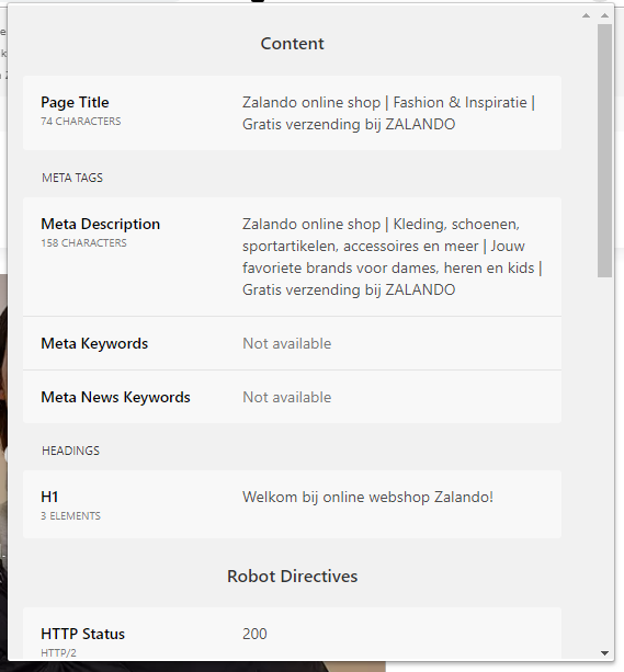 Met de chrome extensie SEO Peek kun je slechts met één klik de basis SEO-factoren op een pagina van een website controleren. Door het controleren van het Document Object Model (DOM) wordt een pagina gescand. Aan de hand van dit model verstuurd SEO Peek een verzoek naar de server om verschillende HTTP Response Headers en robotrichtlijnen, zoals HTTP-status en metarobots, te begrijpen. Het toont ook kopinformatie, metatags, linktags en de paginatitel. Ideaal dus om snel een pagina te controleren op basis factoren.