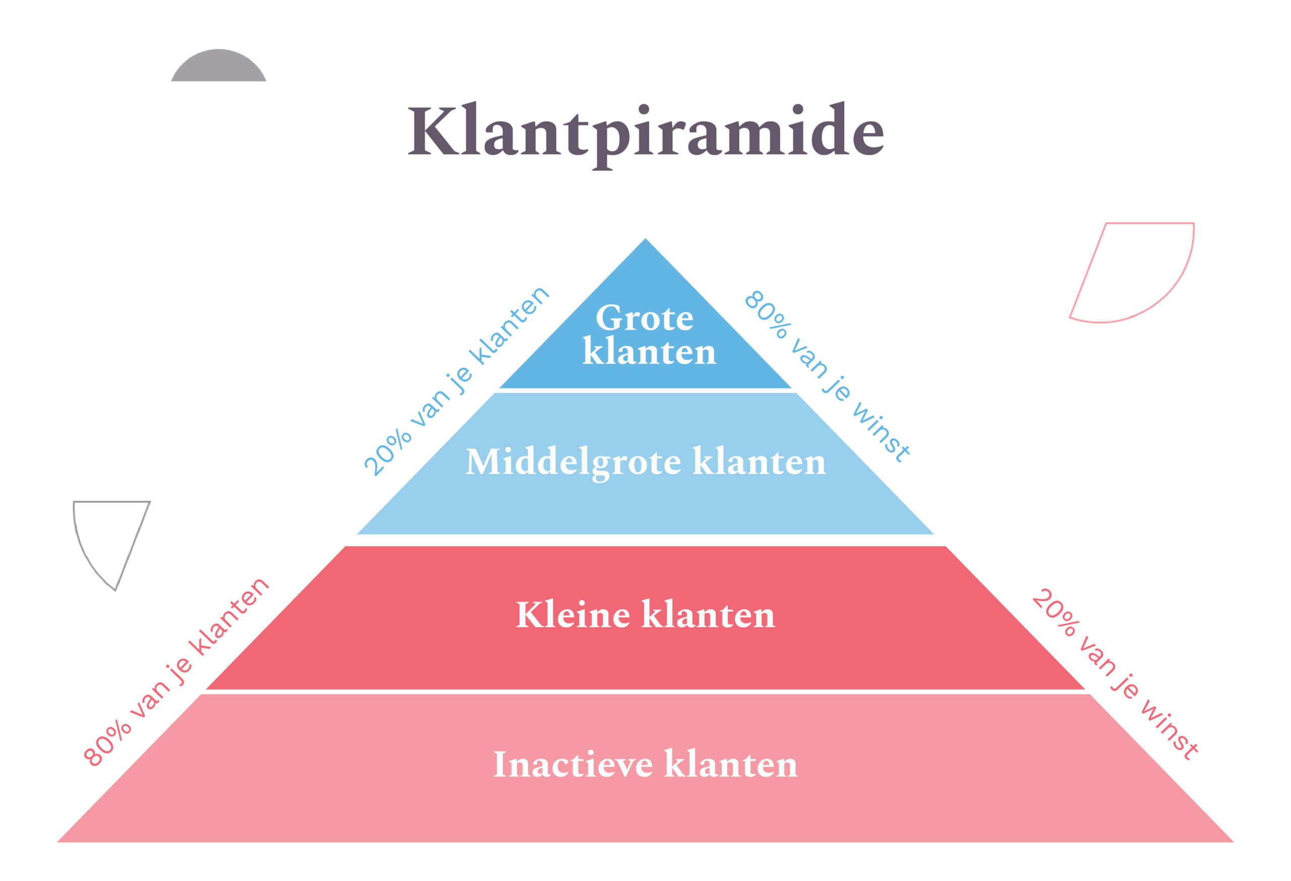 Belangrijk is dat je al deze marketingonderdelen richt op het aantrekken én behouden van klanten. De klantenpiramide helpt je hierbij door de nadruk te leggen op de waardevolle klanten die een groot deel van je omzet genereren.