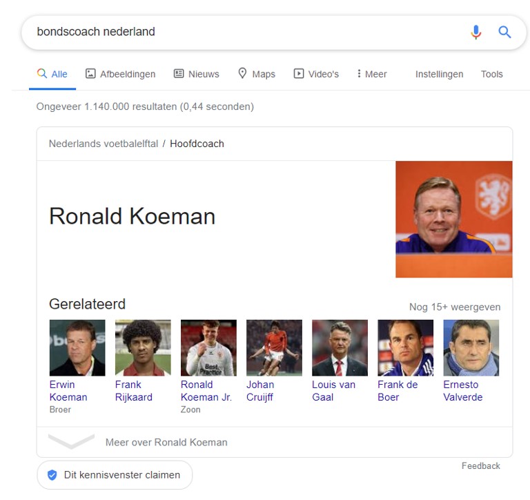 Ondanks het feit dat we Ronald Koeman niet eens genoemd hebben, begrijpt Google nog steeds wat we zoeken en geeft ons het antwoord.