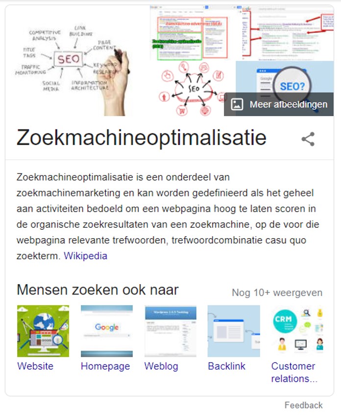 Gebaseerd op een onlangs verschenen studie van Rand Fishkin, resulteert meer dan 50% van de zoekopdrachten in geen enkele klik op een zoekresultaat. Een deel van de reden dat dit gebeurd, is te wijten aan de Knowledge Graph, die Google helpt om meer vragen direct in de SERP te beantwoorden. Kijk maar naar een vraag als “Wat is SEO”: