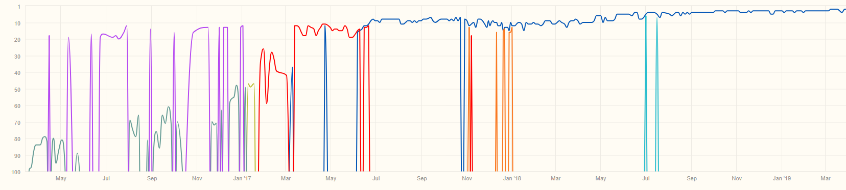Wil je graag aan de slag gaan met bloggen voor jouw bedrijf? Zorg er dan voor dat je het onderwerp niet laat overlappen met het onderwerp van één van je pagina’s. Het komt bij blogs namelijk vaak voor dat ze gaan ‘concurreren’ met een andere pagina op je website. Door vooraf een overzicht te maken voor welke zoektermen je schrijft, voorkom je dat de nieuwe pagina gaat concurreren met een reeds bestaande. Interne concurrentie heeft een negatief effect op de overall posities van je webshop of website en daarmee schiet je het doel voorbij. Dit is ook de reden dat – in tegenstelling tot het standaard advies om een blog op dezelfde domein te zetten – sommige partijen een blog op een subdomein zetten om deze interne concurrentie te voorkomen. In onderstaande grafiek van Ahrefs zie je hoe een blogpagina concurreert met een webpagina: