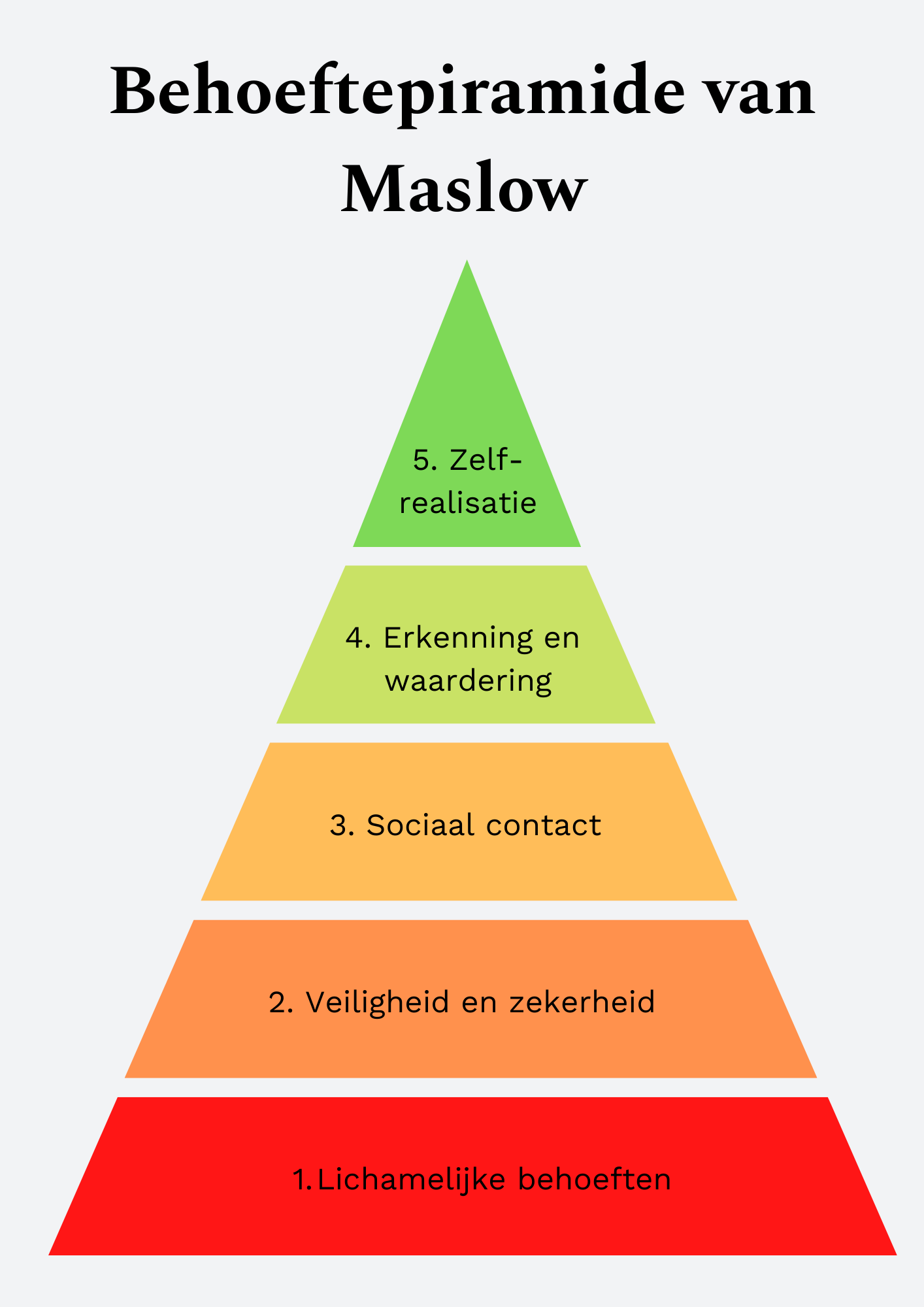 Je hebt er misschien wel eens van gehoord: de behoeften piramide van Maslow. Maslow maakte een psychologische theorie die de behoeften van mensen opdeelt in vijf categorieën. Mensen krijgen pas behoefte aan zaken uit een bepaalde categorie, als de onderliggende categorie is voldaan. In de realiteit werkt het niet altijd precies zo, maar in de grote lijnen klopt het wel.