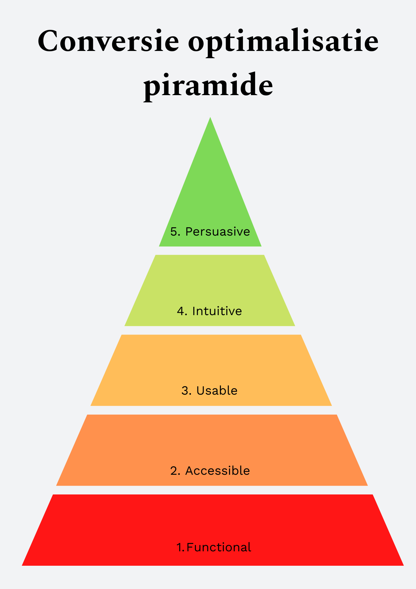 De conversie optimalisatie piramide bestaat uit verschillende lagen. Omdat de lagen van onder naar boven voldaan moeten worden, worden ze omschreven vanaf onderaan de conversie optimalisatie piramide.