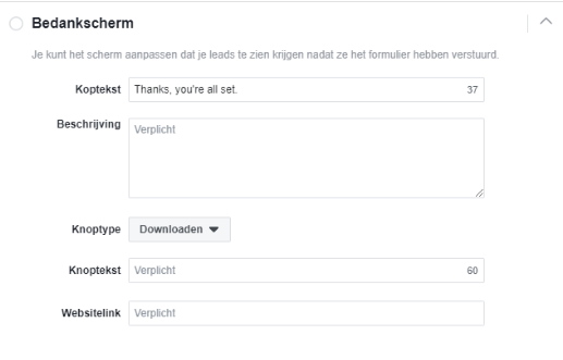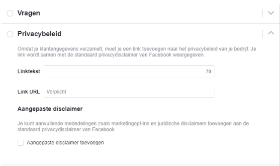 Facebook maakt altijd gebruik van een standaard ‘disclaimer’. Ben je het hier niet mee eens? Dan biedt het platform je nog wel de mogelijkheid om een extra aangepaste disclaimer toe te voegen. Als laatste stap is het instellen van een bedankpagina. Ook deze pagina is in Facebook zelf, je wordt dus niet doorgestuurd naar jouw eigen website.