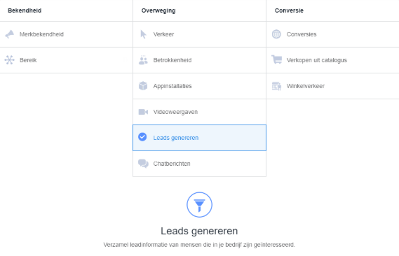 Vervolgens ga je naar het advertentiebeheer in Facebook en klik je op de type campagne: leads genereren.