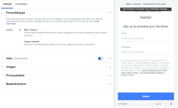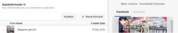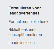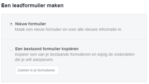 Klik hierbij op ‘nieuw formulier’ en je krijgt de mogelijkheid om een nieuw formulier te maken. Dit formulier wordt dus gebruikt wanneer de bezoeker klikt op de button van een Facebook lead ad.