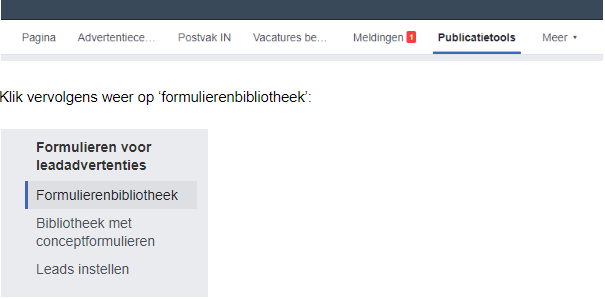 De campagne loopt en in het advertentiebeheer is te zien dat de eerste leads ook al zijn binnengekomen, maar je kunt ze nog nergens vinden in het advertentiebeheer. Dat klopt! Facebook heeft het namelijk zo ingesteld dat deze leads zijn terug te vinden binnen de pagina en dus niet in het advertentiebeheer! Ga hiervoor weer naar de pagina en naar publicatietools: