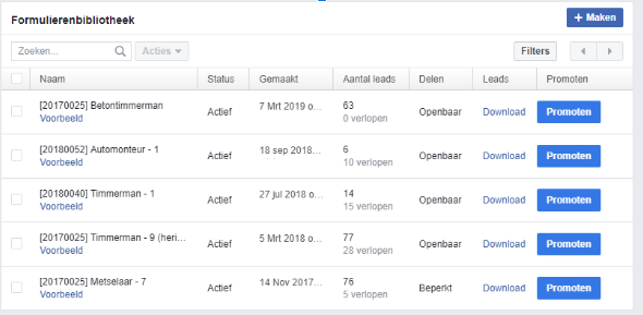 Hier zie je vervolgens de verschillende formulieren en kun je ook zien hoeveel leads deze hebben genereert. Je klikt op ‘Download’ en je kunt de leads vanuit Facebook in een .csv of .excel bestand halen. Dit zorgt ervoor dat je de lead uit Facebook hebt gehaald.