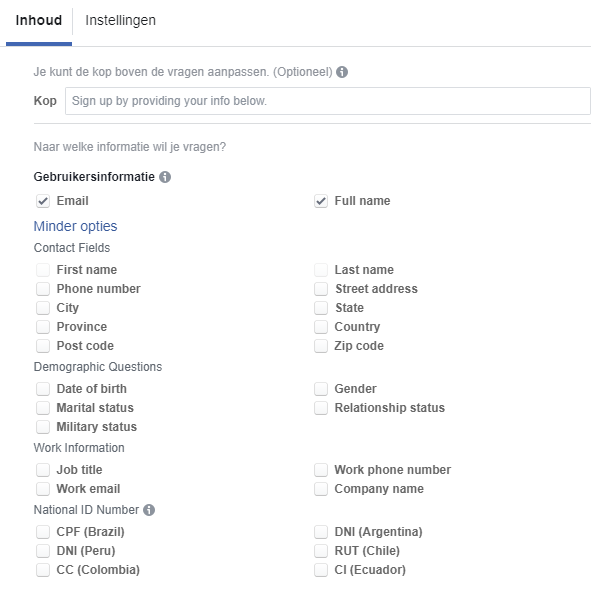 De volgende stap ‘vragen’ heeft te maken met de data die je van de gebruiker nodig hebt. Het is onze ervaring dat het succesvoller is om het aantal data wat je nodig hebt te beperken tot het noodzakelijke. Gebruikers hebben nog niet altijd door wat Facebook wel niet van ze weet, dus daarom kun je hen afschrikken als je een hele lijst met data uit de onderstaande mogelijkheden kiest.