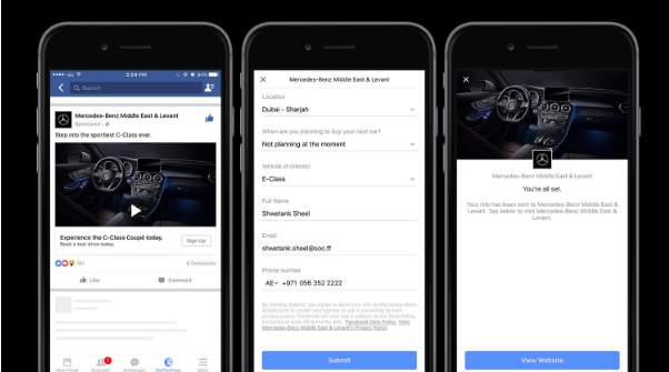 Het onderstaand is een voorbeeld van Mercedes-Benz. Links zie je een advertentie met een knop als ‘sign up’. Als de gebruiker hier op klikt krijgt hij/zij het middelste scherm te zien. Hierin wordt alle data van de gebruiker ingevuld door Facebook. Perfect, want hierdoor hoef je als gebruiker niet opnieuw jouw persoonsgegevens in te vullen. Tevens ben je nog maar één klik verwijderd van de conversie. De bezoeker leest snel zijn gegevens door, deze kloppen en klikt vervolgens op de blauwe button onderaan het middelste screenshot. De gebruiker komt op een bedankpagina en krijgt de bevestiging dat de conversie is gelukt. Tevens heeft de gebruiker nu de mogelijkheid om terug te klikken naar Facebook, maar ook om naar een externe link door te gaan en eventueel van extra informatie te voorzien.