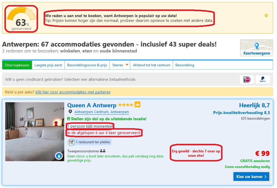 Waarschijnlijk herken je dit punt snel, boek maar een keer een hotel via Booking.com en je zult het principe snel tegenkomen. “Nog 1 kamer beschikbaar”, “5 anderen kijken momenteel” en ga zo nog maar even door. Waar we ons soms lichtelijk irriteren aan al deze meldingen, werkt het brein toch anders. Door deze schaarste herkent ons brein een stukje verlies. Hoe dit werkt? Ons brein krijgt het idee dat we een stukje keuzevrijheid verliezen, waardoor onze waarde afneemt. En ja, hierdoor maken we sneller een keuze onder invloed van systeem 1. Dit principe kun je eenvoudig toepassen op de website, door bijvoorbeeld de voorraad te benoemen. Maar ook het geven van een verzendtermijn kan werken.