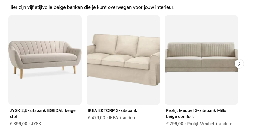 Dat is voor nu nog gissen. Wel weten we dat er nu in de organische resultaten van ChatGPT er op vragen met een meer commerciële zoekintentie soms al producten worden getoond. Hieronder vind je een voorbeeld van hoe dit eruitziet als je typt dat je op zoek bent naar vijf beige banken voor je woonkamer. ChatGPT Advertenties zouden er ook zo uit kunnen zien, maar dan voorzien van een sponsored label.
