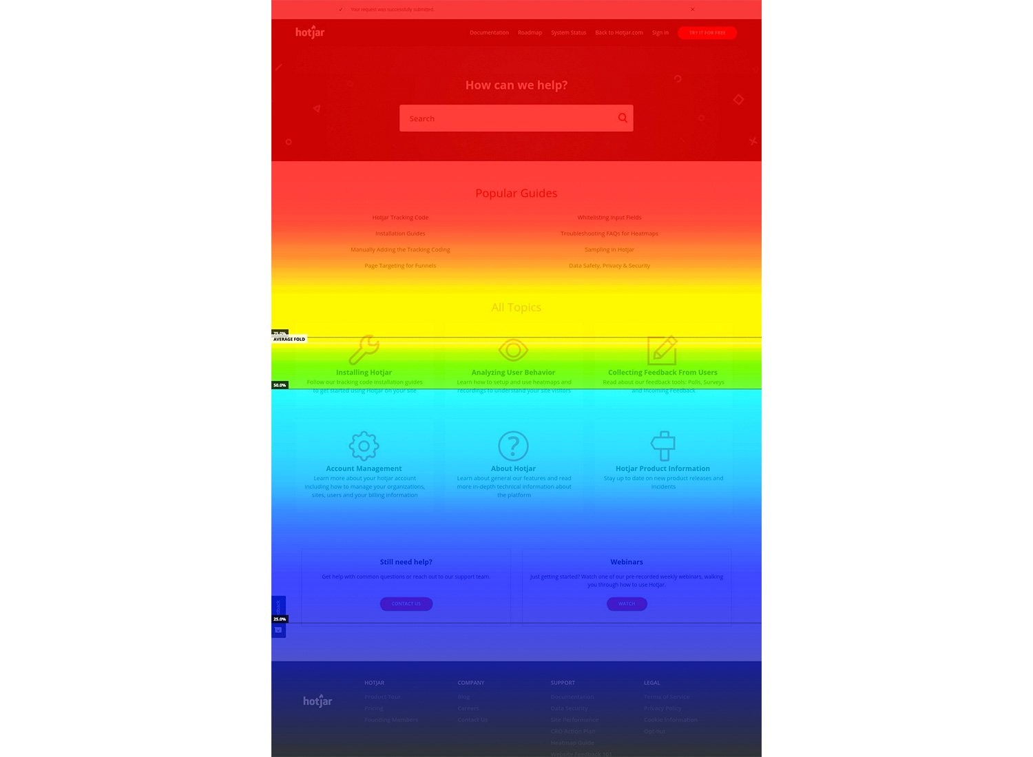 Een scroll map geeft het exacte percentage van bezoekers weer, die scrollen tot een bepaald punt op de website. Hoe roder de website, hoe meer bezoekers dit gedeelte hebben gezien.