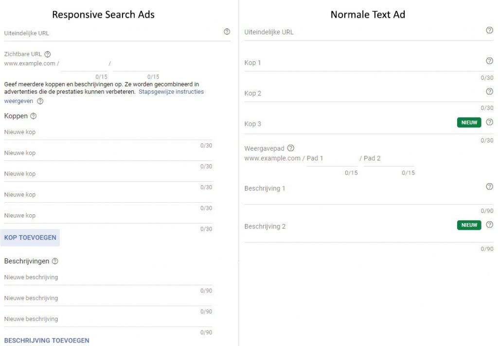 Waar je normaal gesproken dus per advertentie bepaalt wat erin moet komen te staan, helpt Google de beste match te maken met Responsive Search ads. Je geeft aan wat je in de kop wil zetten en welke beschrijving er vertoond moet worden.