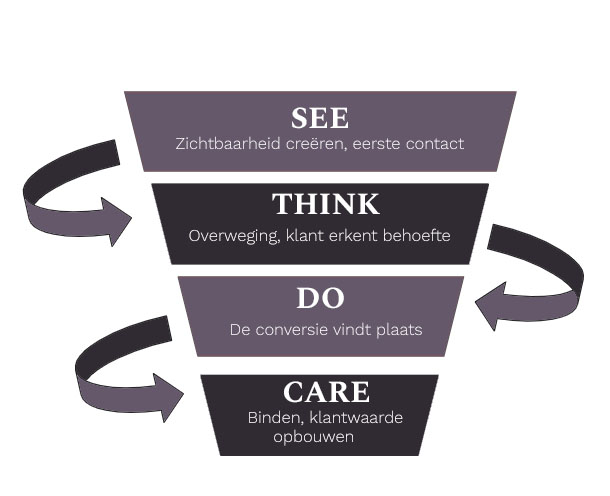 Het model is opgebouwd als trechter, of ‘funnel’, waarbij de see- en think-fases zorgen voor de ‘do’ — de conversie. In de eerste twee fases moeten we dus stappen ondernemen om de conversie in de do-fase te behalen. Iemand moet tenslotte eerst kennis hebben gemaakt met jouw bedrijf/service of product om het überhaupt te kunnen kopen. In een steeds competitievere online markt wordt de meerwaarde van een ‘top-funnel’ strategie bovendien steeds duidelijker. Merken met een trouw klantenbestand blijven – ook als de markt wat inzakt – overeind. Het slim inzetten van de see-, think- en do-fase kan je omzet dan ook sterk verhogen. Maar onderschat de kracht van de care-fase ook niet. Het liefst behoud je bestaande klanten. Met loyaliteitsprogramma’s aan de slag gaan kan daarom erg zinvol zijn voor de uiteindelijke klantwaarde (Customer Lifetime Value).