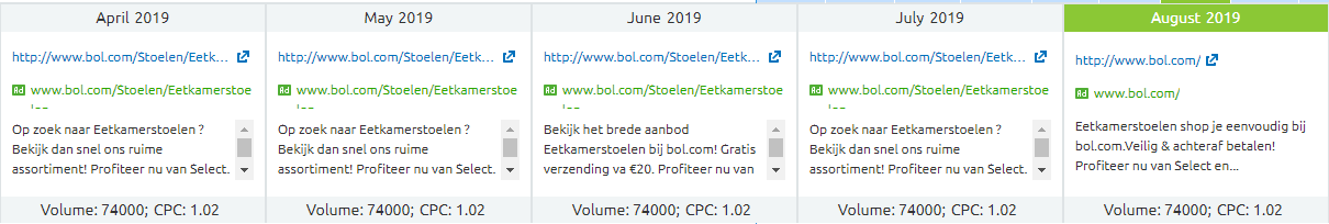 In bovenstaande afbeelding zie je dat Bol.com gedurende een aantal maanden diverse varianten voor eetkamerstoel advertenties gebruikt. Toch zien we dat ze later weer teruggaan naar de variant met de tekst “Op zoek naar Eetkamerstoelen?”.