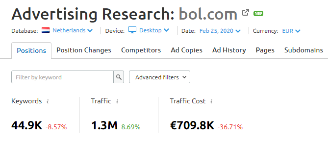 Dit rapport kun je gebruiken om voor iedere gewenste website informatie te verkrijgen over hoe zij omgaan met hun advertising. Zodra er een URL wordt gevuld zie je bovenaan een schatting staan op hoeveel zoekwoorden ze adverteren, hoeveel kosten ze zullen maken en hoeveel verkeer de website er mee binnenhaalt.