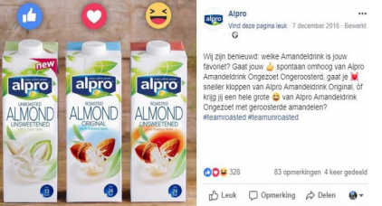 De marketingafdeling van Alpro heeft handig ingespeeld op de mogelijkheden van de nieuwe like- button. Het bedrijf deed op creatieve wijze marktonderzoek onder haar volgers door te vragen: welke Amandeldrink is jouw favoriet? De vraag kon beantwoord worden aan de hand van een emoji, welke is geïntegreerd in de like-button van Facebook. Creatief én effectief deze vorm van interactie, want op deze manier kan je er achter komen wat jouw klanten en potentiële klanten vinden en willen.
