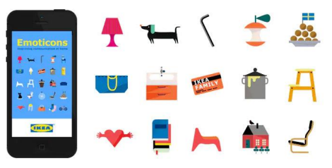 IKEA beweert dat mannen en vrouwen beter met elkaar zouden kunnen opschieten als ze meer emoji’s gebruiken in hun communicatie. Om die reden introduceert IKEA haar eigen emoticons: het communicatiemiddel voor meer liefde en begrip bij je thuis. De emoticons worden ook gebruikt in de applicatie om productgroepen te categoriseren. Het is wachten op het moment dat de emoticons ook zichtbaar zijn in de online communicatie of zelfs fysieke winkels.