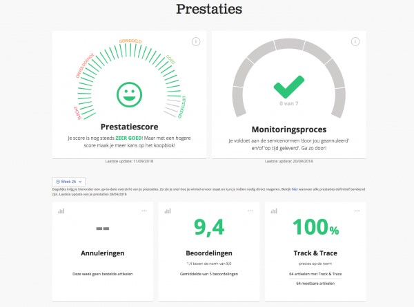Voor bol is de prijs een graadmeter. Het aanbieden van producten met een concurrerende prijs is daarom belangrijk. Maar niet alleen de prijs bepaalt de positie. Ook de leverbelofte speelt een belangrijke rol op dit gebied. Hierbij wordt gekeken of je de belofte die je maakt ook daadwerkelijk realiseert, kortom lever je wel binnen de termijn dat je belooft? Het is per productcategorie verschillend in welke mate deze variabelen wegen. Hierbij kijkt bol naar het klantgedrag, waarna aanpassingen in de wegingsfactoren worden doorgevoerd. Door in het menu ‘Prestaties’ in het verkoopaccount te kijken, krijg je snel een overzicht van jouw scores. Optimaliseren wordt daarna kinderspel, want je weet immers wat je moet veranderen voor een betere score!