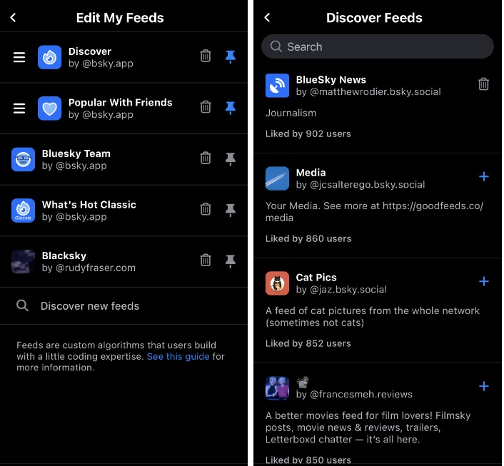 Onderaan BlueSky vind je drie tijdlijnopties: volgen, ontdekken en populair. Je kan jouw interesses ook fragmenteren in verschillende tijdlijnen, zodat je overzicht bewaart in de wildgroei aan berichten.
