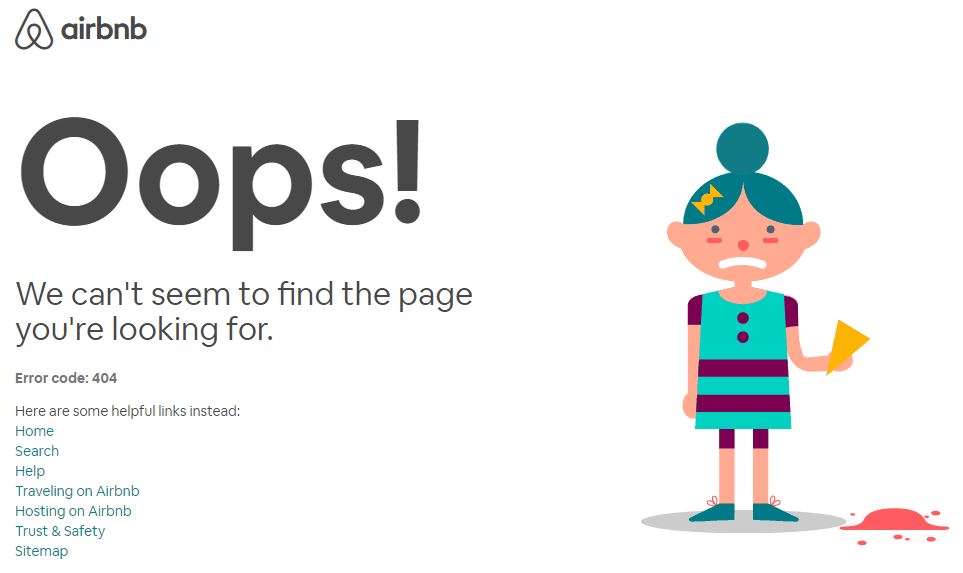 Simpel maar effectief, dat is de 404 pagina van Airbnb. Het geanimeerde poppetje geeft wat extra’s aan de pagina maar leidt niet af van de links die de pagina bevat als suggestie voor de verdwaalde bezoeker.