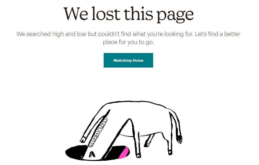 Mailchimp begrijpt ook dat je de 404 pagina beter simpel maar stijlvol kunt houden. Ook de tekst die op deze pagina staat sluit leuk aan bij de visual. Een kleine glimlach op het gezicht van je bezoeker tonen, kan nooit kwaad!