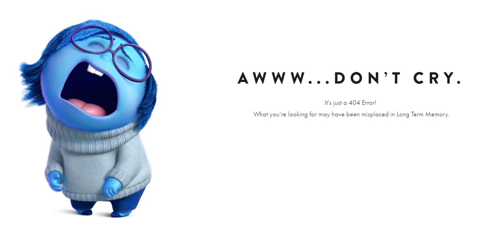 Met een leuke tekst of afbeelding die inspeelt op je eigen branche of business kun je van je 404 error page not found een leuke inhaker maken. Neem bijvoorbeeld de 404 pagina van Pixar. Hier krijg je als bezoeker de mededeling dat de pagina die je zoekt misschien per ongeluk naar het langetermijngeheugen is verplaatst – zoals bij veel zaken het geval is in de populaire Pixar-film Inside Out.