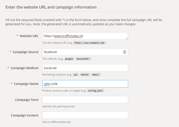 - Campaign content: Gebruik het veld campagne content als je verschillen tussen advertenties, in dezelfde campagne wil aangeven. Deze is ook niet verplicht.
