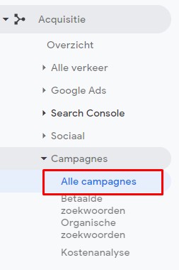 Nu begint de fun. De UTM codes vind je (onder andere) terug in Google Analytics onder ‘Acquisitie – Campagnes – Alle campagnes’.