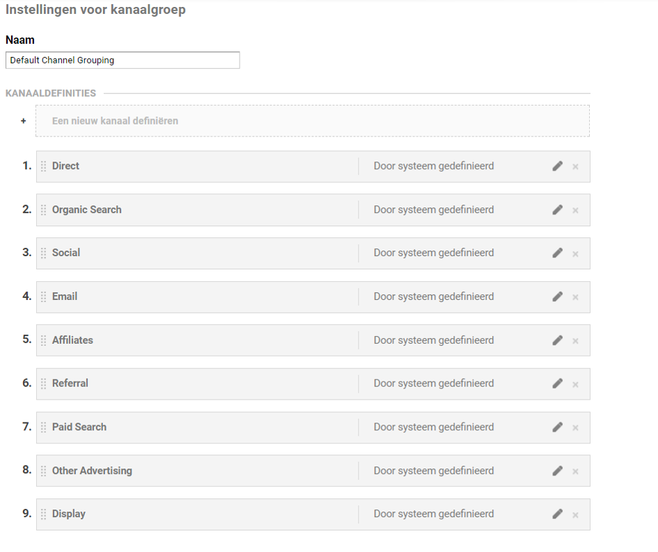Je kunt zelf de kanaalgroepering in Analytics gaan aanpassen. Echter, pas hier wel mee op. Daarom adviseren wij altijd om de standaard kanaalgroepering te kopiëren, en deze aan te passen naar jouw eigen kanaalgroepering. Zo kun je altijd terugvallen op de standaard kanaalgroepering.